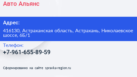 Авто Альянс по адресу 416130, Астраханская область, Астрахань, Николаевское шоссе, 6Б/1 в дальнейшем Организация, размещена в следующих категориях: