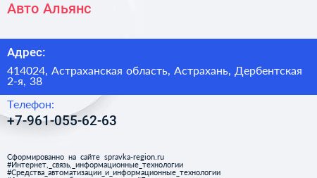 Авто Альянс по адресу 414024, Астраханская область, Астрахань, Дербентская 2-я, 38 в дальнейшем Организация, размещена в следующих категориях: