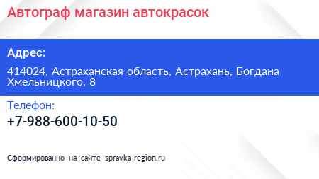 Автограф, магазин автокрасок по адресу 414024, Астраханская область, Астрахань, Богдана Хмельницкого, 8 в дальнейшем Организация, размещена в следующих категориях:
