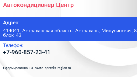 Автокондиционер-Центр по адресу 414041, Астраханская область, Астрахань, Минусинская, 8 блок 43 в дальнейшем Организация, размещена в следующих категориях: