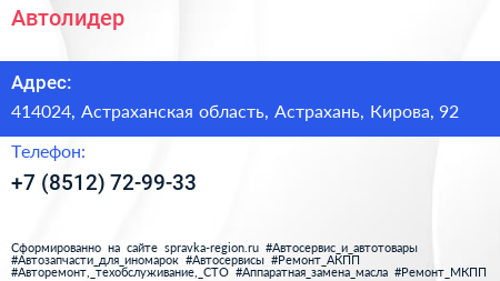 Автолидер по адресу 414024, Астраханская область, Астрахань, Кирова, 92 в дальнейшем Организация, размещена в следующих категориях: