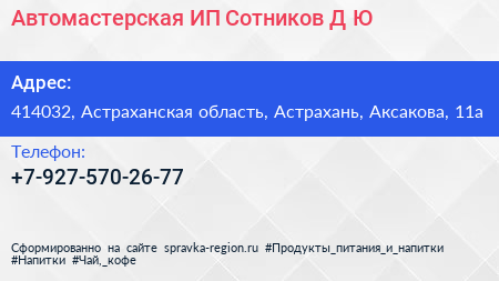 Автомастерская, ИП Сотников Д.Ю. по адресу 414032, Астраханская область, Астрахань, Аксакова, 11а в дальнейшем Организация, размещена в следующих категориях: