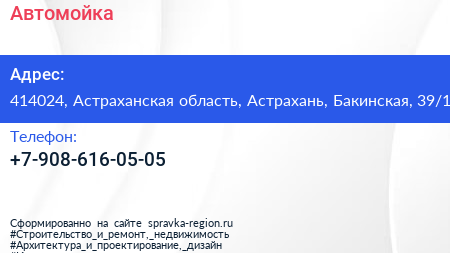 Автомойка по адресу 414024, Астраханская область, Астрахань, Бакинская, 39/1 в дальнейшем Организация, размещена в следующих категориях: