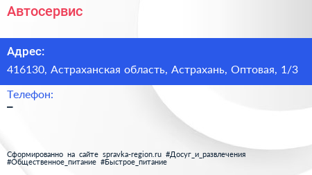 Автосервис по адресу 416130, Астраханская область, Астрахань, Оптовая, 1/3 в дальнейшем Организация, размещена в следующих категориях: