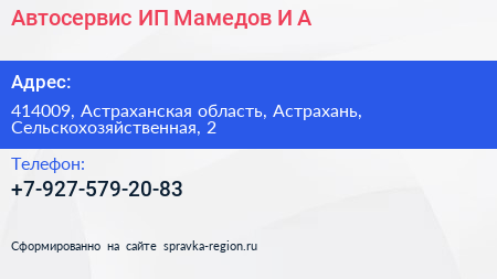 Автосервис, ИП Мамедов И.А. по адресу 414009, Астраханская область, Астрахань, Сельскохозяйственная, 2 в дальнейшем Организация, размещена в следующих категориях: