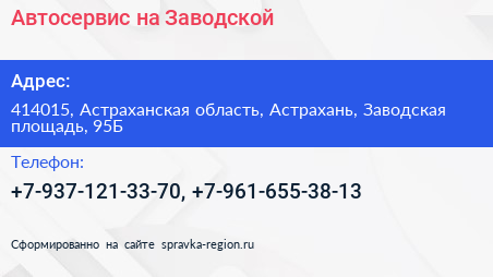 Автосервис на Заводской по адресу 414015, Астраханская область, Астрахань, Заводская площадь, 95Б в дальнейшем Организация, размещена в следующих категориях: