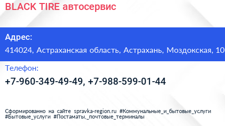 BLACK TIRE, автосервис по адресу 414024, Астраханская область, Астрахань, Моздокская, 10 в дальнейшем Организация, размещена в следующих категориях: