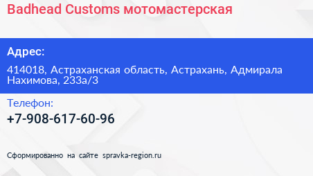 Badhead Customs, мотомастерская по адресу 414018, Астраханская область, Астрахань, Адмирала Нахимова, 233а/3 в дальнейшем Организация, размещена в следующих категориях: