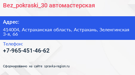 Bez_pokraski_30, автомастерская по адресу 414004, Астраханская область, Астрахань, Зеленгинская 3-я, 66 в дальнейшем Организация, размещена в следующих категориях: