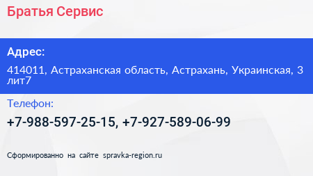 Братья Сервис по адресу 414011, Астраханская область, Астрахань, Украинская, 3 лит7 в дальнейшем Организация, размещена в следующих категориях:
