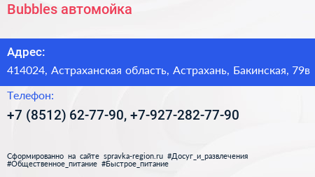 Bubbles, автомойка по адресу 414024, Астраханская область, Астрахань, Бакинская, 79в в дальнейшем Организация, размещена в следующих категориях: