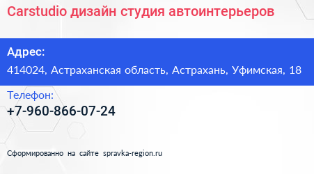 Carstudio, дизайн-студия автоинтерьеров по адресу 414024, Астраханская область, Астрахань, Уфимская, 18 в дальнейшем Организация, размещена в следующих категориях: