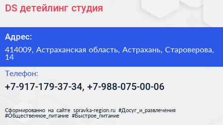 DS, детейлинг-студия по адресу 414009, Астраханская область, Астрахань, Староверова, 14 в дальнейшем Организация, размещена в следующих категориях: