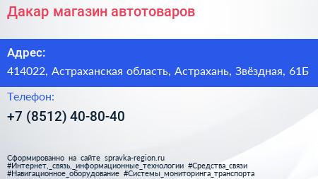 Дакар, магазин автотоваров по адресу 414022, Астраханская область, Астрахань, Звёздная, 61Б в дальнейшем Организация, размещена в следующих категориях:
