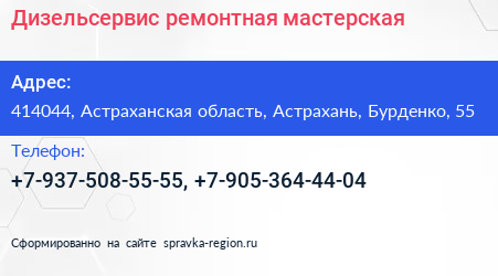 Дизельсервис, ремонтная мастерская по адресу 414044, Астраханская область, Астрахань, Бурденко, 55 в дальнейшем Организация, размещена в следующих категориях: