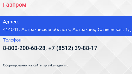 Газпром по адресу 414041, Астраханская область, Астрахань, Славянская, 1д в дальнейшем Организация, размещена в следующих категориях: