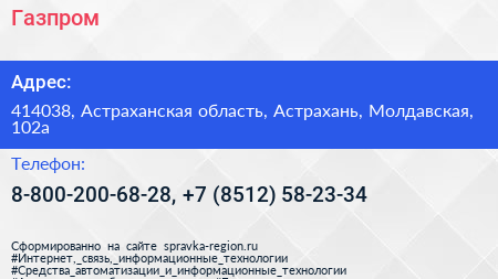 Газпром по адресу 414038, Астраханская область, Астрахань, Молдавская, 102а в дальнейшем Организация, размещена в следующих категориях: