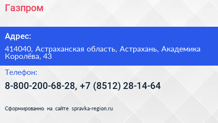 Газпром по адресу 414040, Астраханская область, Астрахань, Академика Королёва, 43 в дальнейшем Организация, размещена в следующих категориях: