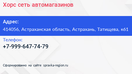 Хорс, сеть автомагазинов по адресу 414056, Астраханская область, Астрахань, Татищева, к61 в дальнейшем Организация, размещена в следующих категориях: