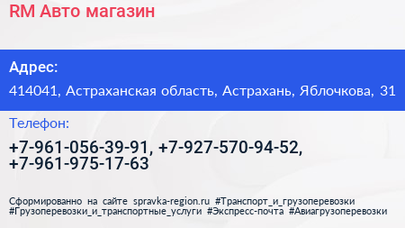 RM Авто, магазин по адресу 414041, Астраханская область, Астрахань, Яблочкова, 31 в дальнейшем Организация, размещена в следующих категориях: