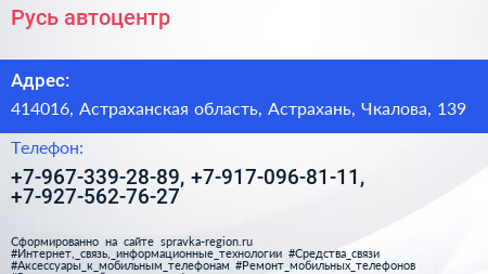 Русь, автоцентр по адресу 414016, Астраханская область, Астрахань, Чкалова, 139 в дальнейшем Организация, размещена в следующих категориях:
