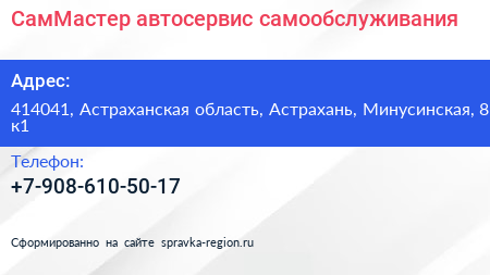 СамМастер, автосервис самообслуживания по адресу 414041, Астраханская область, Астрахань, Минусинская, 8 к1 в дальнейшем Организация, размещена в следующих категориях: