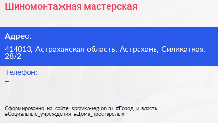 Шиномонтажная мастерская по адресу 414013, Астраханская область, Астрахань, Силикатная, 28/2 в дальнейшем Организация, размещена в следующих категориях:
