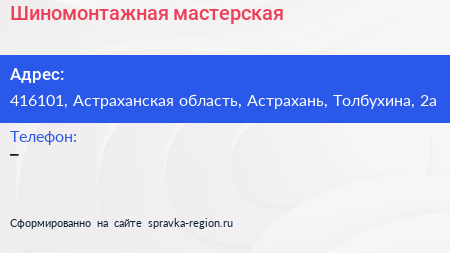 Шиномонтажная мастерская по адресу 416101, Астраханская область, Астрахань, Толбухина, 2а в дальнейшем Организация, размещена в следующих категориях: