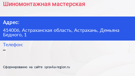 Шиномонтажная мастерская по адресу 414006, Астраханская область, Астрахань, Демьяна Бедного, 1 в дальнейшем Организация, размещена в следующих категориях: