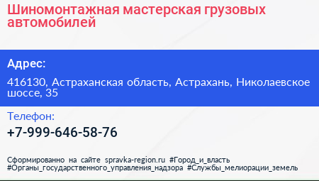 Шиномонтажная мастерская грузовых автомобилей по адресу 416130, Астраханская область, Астрахань, Николаевское шоссе, 35 в дальнейшем Организация, размещена в следующих категориях: