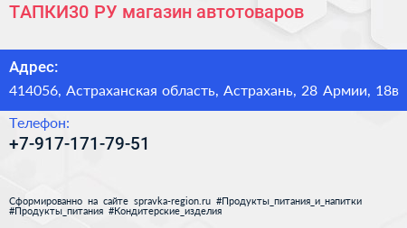 ТАПКИ30.РУ, магазин автотоваров по адресу 414056, Астраханская область, Астрахань, 28 Армии, 18в в дальнейшем Организация, размещена в следующих категориях:
