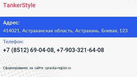 TankerStyle по адресу 414021, Астраханская область, Астрахань, Боевая, 123 в дальнейшем Организация, размещена в следующих категориях: