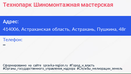 Технопарк, Шиномонтажная мастерская по адресу 414006, Астраханская область, Астрахань, Пушкина, 48г в дальнейшем Организация, размещена в следующих категориях: