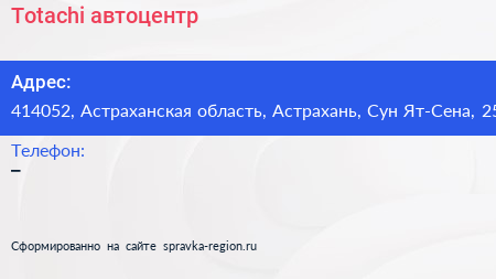 Totachi, автоцентр по адресу 414052, Астраханская область, Астрахань, Сун Ят-Сена, 25 в дальнейшем Организация, размещена в следующих категориях: