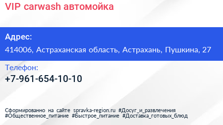 VIP carwash, автомойка по адресу 414006, Астраханская область, Астрахань, Пушкина, 27 в дальнейшем Организация, размещена в следующих категориях: