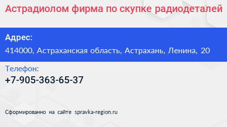 Астрадиолом, фирма по скупке радиодеталей по адресу 414000, Астраханская область, Астрахань, Ленина, 20 в дальнейшем Организация, размещена в следующих категориях: