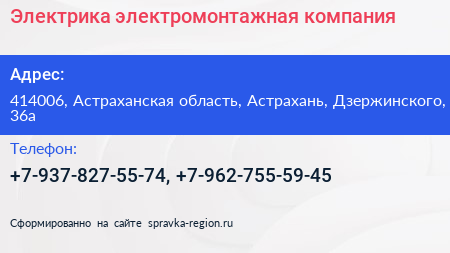 Электрика, электромонтажная компания по адресу 414006, Астраханская область, Астрахань, Дзержинского, 36а в дальнейшем Организация, размещена в следующих категориях: