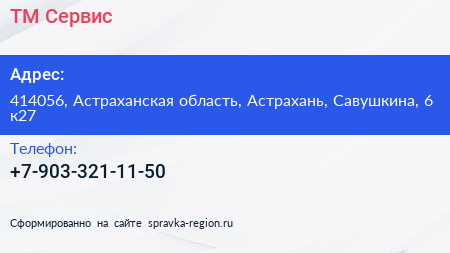 ТМ-Сервис по адресу 414056, Астраханская область, Астрахань, Савушкина, 6 к27 в дальнейшем Организация, размещена в следующих категориях: