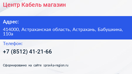 Центр-Кабель, магазин по адресу 414000, Астраханская область, Астрахань, Бабушкина, 110а в дальнейшем Организация, размещена в следующих категориях: