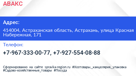 АВАКС по адресу 414004, Астраханская область, Астрахань, улица Красная Набережная, 171 в дальнейшем Организация, размещена в следующих категориях:
