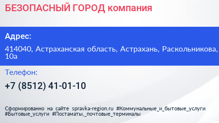 БЕЗОПАСНЫЙ ГОРОД, компания по адресу 414040, Астраханская область, Астрахань, Раскольникова, 10а в дальнейшем Организация, размещена в следующих категориях: