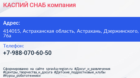 КАСПИЙ-СНАБ, компания по адресу 414015, Астраханская область, Астрахань, Дзержинского, 76а в дальнейшем Организация, размещена в следующих категориях: