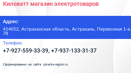 Киловатт, магазин электротоваров по адресу 414052, Астраханская область, Астрахань, Перевозная 1-я, 78 в дальнейшем Организация, размещена в следующих категориях:
