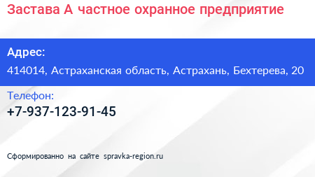 Застава-А, частное охранное предприятие по адресу 414014, Астраханская область, Астрахань, Бехтерева, 20 в дальнейшем Организация, размещена в следующих категориях: