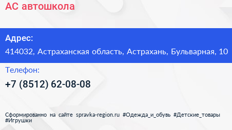 АС, автошкола по адресу 414032, Астраханская область, Астрахань, Бульварная, 10 в дальнейшем Организация, размещена в следующих категориях: