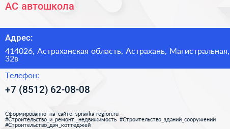 АС, автошкола по адресу 414026, Астраханская область, Астрахань, Магистральная, 32в в дальнейшем Организация, размещена в следующих категориях: