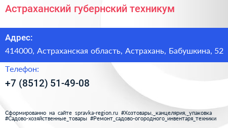 Астраханский губернский техникум по адресу 414000, Астраханская область, Астрахань, Бабушкина, 52 в дальнейшем Организация, размещена в следующих категориях: