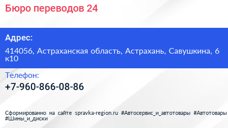 Бюро переводов 24 по адресу 414056, Астраханская область, Астрахань, Савушкина, 6 к10 в дальнейшем Организация, размещена в следующих категориях: