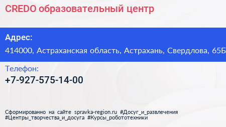 CREDO, образовательный центр по адресу 414000, Астраханская область, Астрахань, Свердлова, 65Б в дальнейшем Организация, размещена в следующих категориях:
