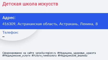 Детская школа искусств по адресу 416309, Астраханская область, Астрахань, Ленина, 8 в дальнейшем Организация, размещена в следующих категориях: